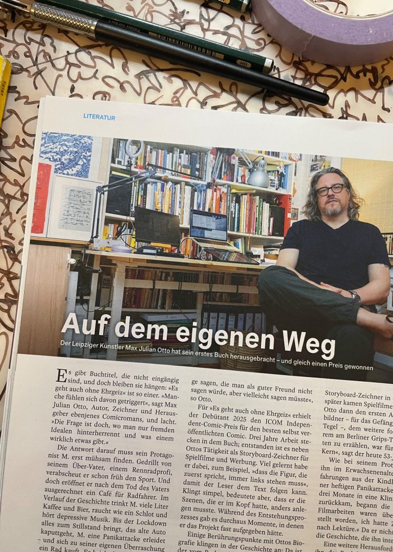 Wer ein bißchen über den Hintergrund meines Comicromans "Es geht auch ohne Ehrgeiz – willkommen im Café Cyliste" erfahren möchte, findet einen schönen Artikel in der Dezember-Ausgabe (12/25) des Stadtmagazins "kreuzer". Geschrieben hat ihn Andrea Kathrin Kraus, das Foto hat Christiane Gundlach gemacht.